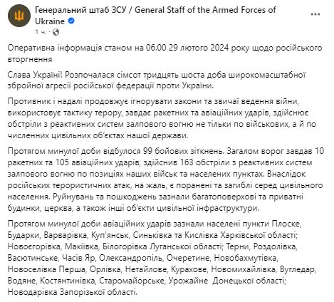 Утром 29 февраля Генштаб ВСУ обнародовал сводку о ситуации на фронте за минувшие сутки.