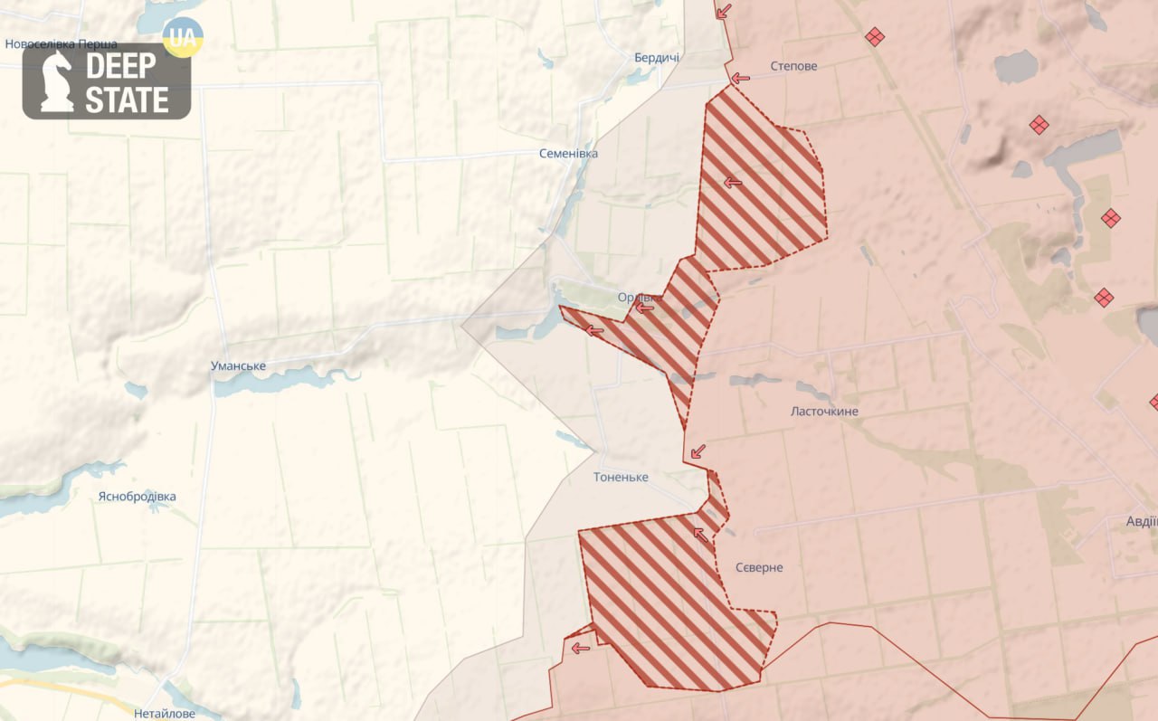 Российские войска продвинулись внутри села Орловка к западу от Авдеевки. Это следует из карты украинского военного паблика Deep State.
