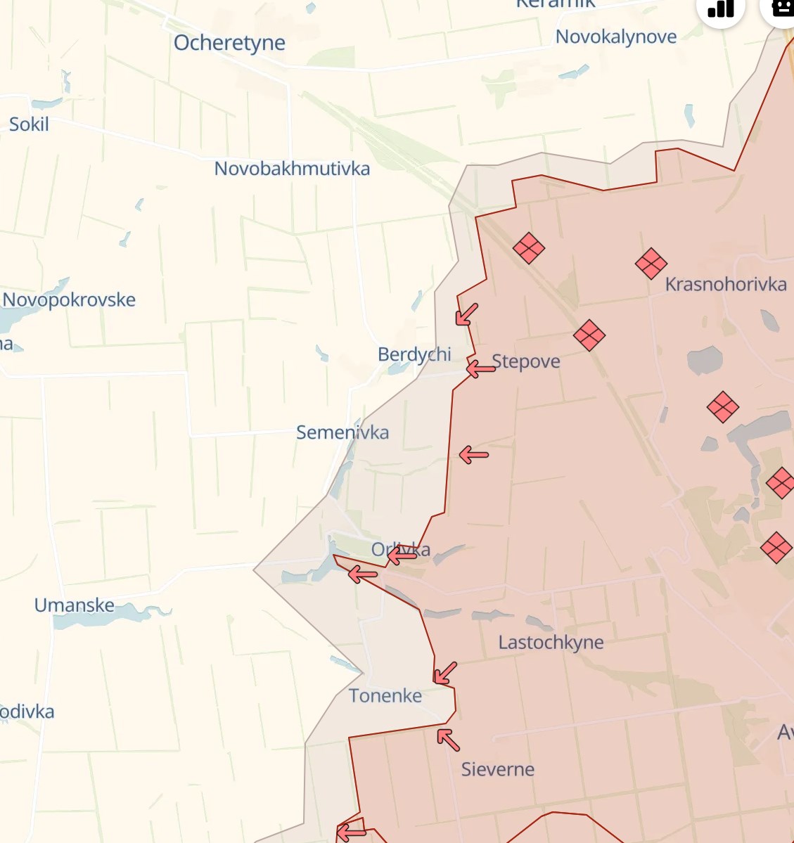 Видно, что захвачена как минимум половина села, а вся его территория - в "серой" зоне (то есть там идут бои). Аналогичная ситуация в Тоненьком южнее Орловки.