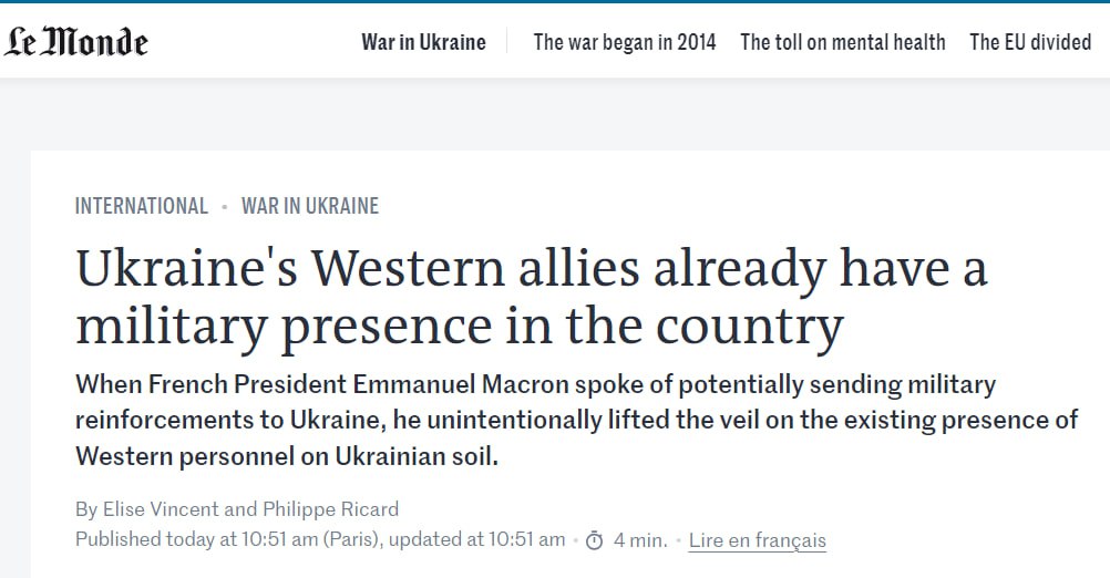Вчера Макрон назвал "взвешенными" все свои слова о возможности отправки западных войск в Украину, тем самым опровергнув слова своего же министра обороны.