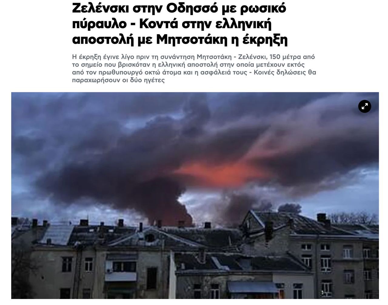 Газета ссылается на анонимные источники в правительстве Греции. Утверждается, что удар был нанесён, когда кортеж Зеленского находился с греческой делегацией.