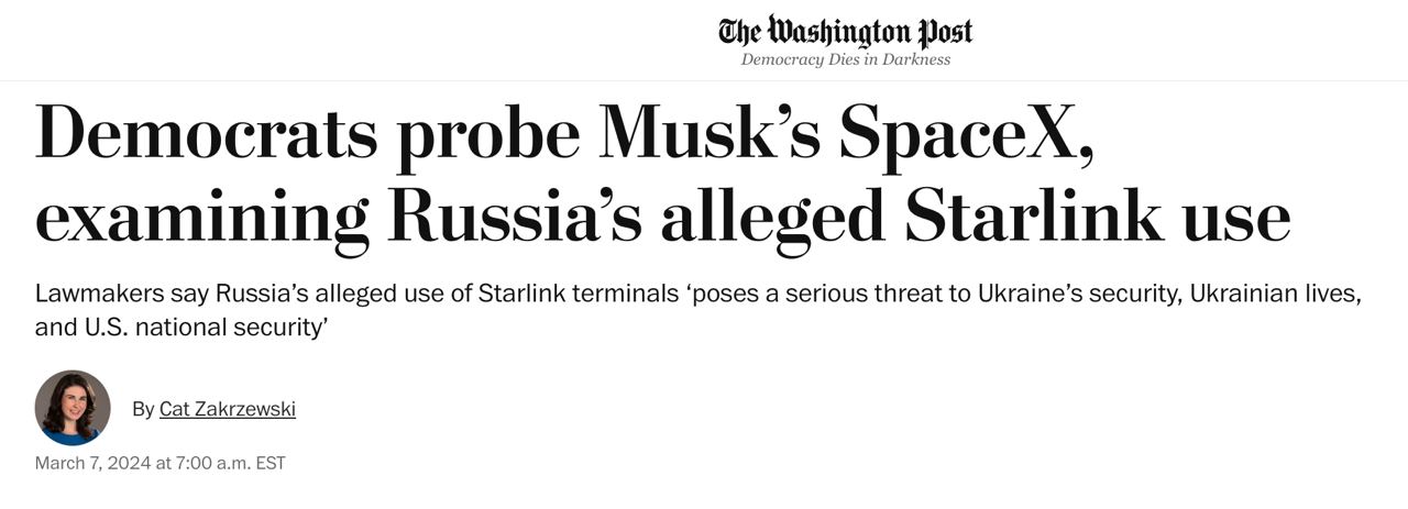 Законодатели предупредили президента SpaceX Гвинна Шотвелла, что использование Россией Starlink "представляет серьезную угрозу для безопасности Украины, жизни украинцев и национальной безопасности США".