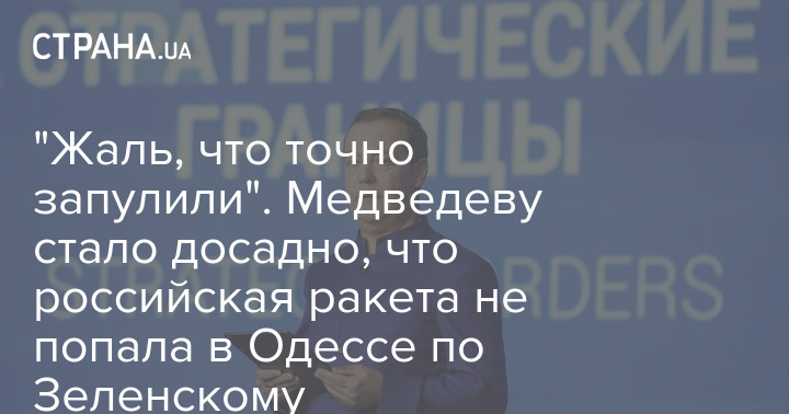 Заместитель председателя Совета безопасности России Дмитрий Медведев заявил, что ему "досадно", что российская ракета не попала вчера по Владимиру Зеленскому, когда тот был с визитом в Одессе.
