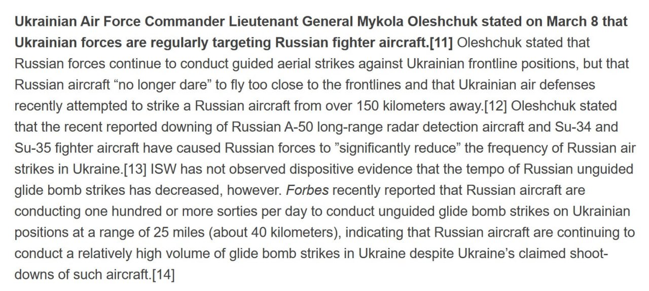 "Это указывает на то, что российские самолеты продолжают совершать относительно большие объемы планирующих полетов и бомбовые удары по Украине, несмотря на заявления Украины о сбитии таких самолетов", - сообщает ISW.