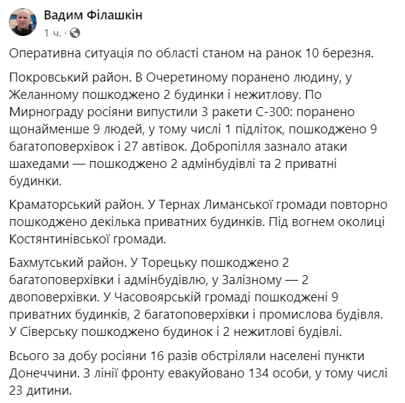 Всего за сутки россияне 16 раз обстреляли населенные пункты Донецкой области. С линии фронта эвакуированы 134 человека, в том числе 23 ребенка.