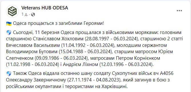 Veterans Hub Odesa публикует фамилии 6 погибших военных моряков: