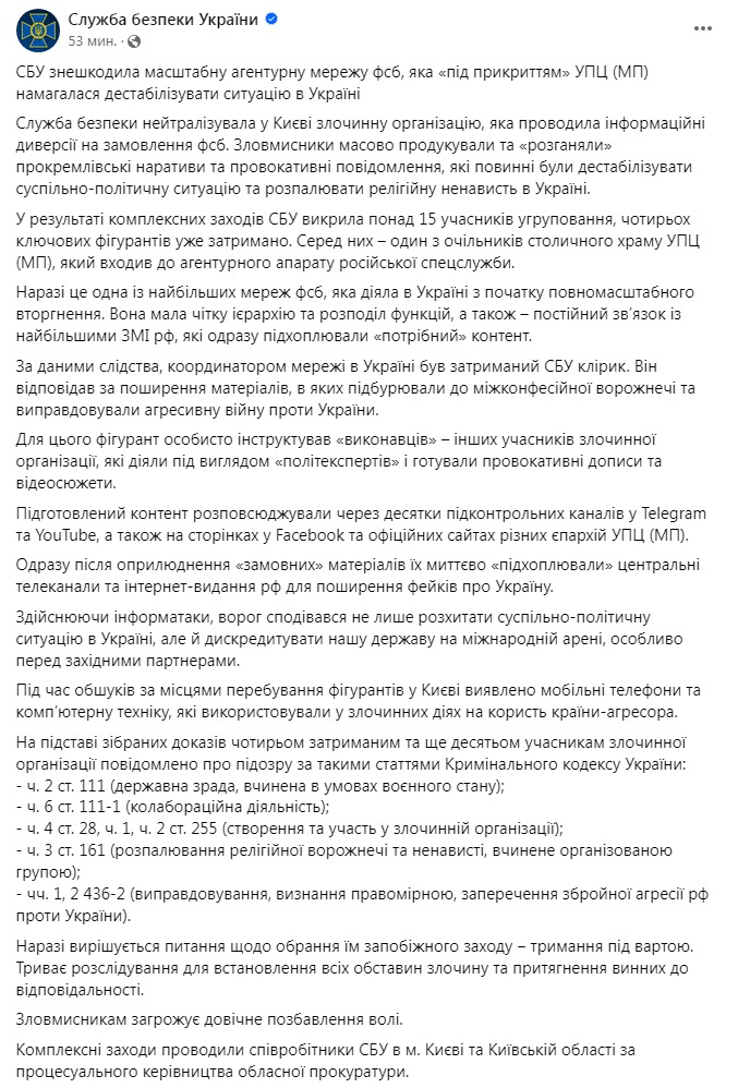 В службе заявили, что "обезвредили масштабную агентурную сеть ФСБ", которая пыталась "дестабилизировать ситуацию в Украине". Фигуранты дела, по версии следствия, "продуцировали и разгоняли прокремлевские нарративы и провокационные сообщения, которые должны были дестабилизировать общественно-политическую ситуацию и разжигать религиозную ненависть в Украине".