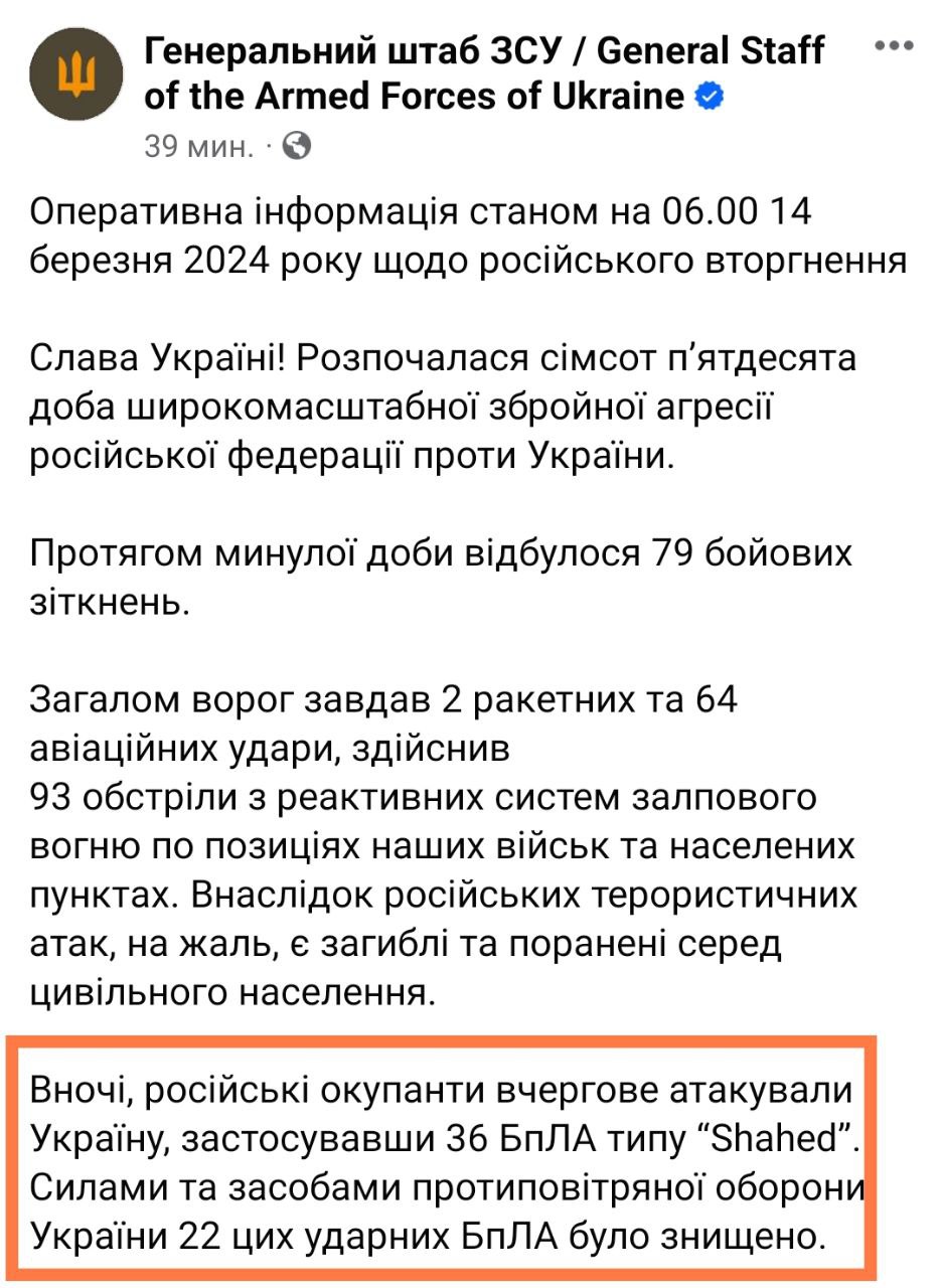В четверг, 14 марта, в Украине идет 750-й день войны с Россией.