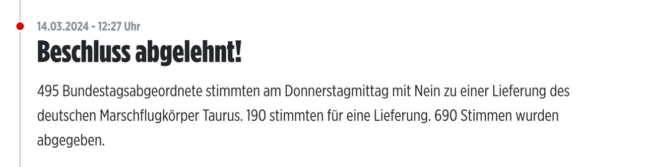 13.45 Бундестаг снова не поддержал требование к правительству ФРГ отправить Украине ракеты Taurus, сообщает Bild.