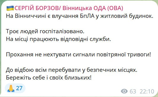 22.15 Глава Винницкой области Сергей Борзов сообщил о попадании «Шахеда» в жилой дом.