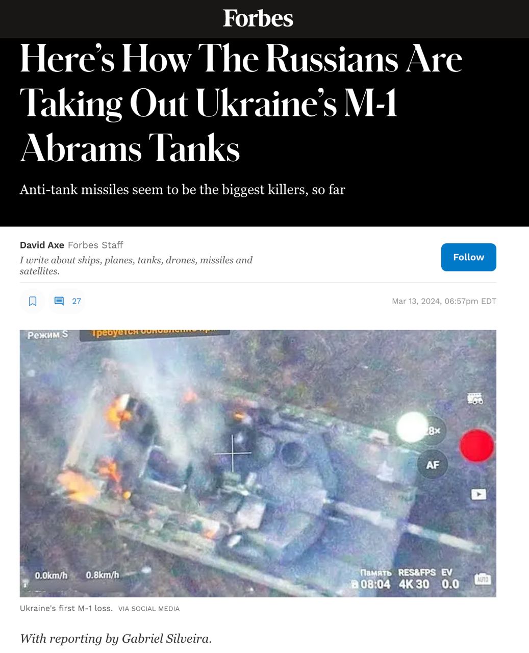 09.35 Forbes анализирует потерю первых трех американских танков Abrams в Украине и дает свою версию, как они были поражены.