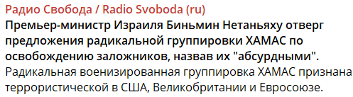 "Радио Свобода" цитирует заявление премьер-министра Израиля: "Несмотря на международное давление, мы войдем в Рафах, завершим ликвидацию оставшихся батальонов ХАМАСа, восстановим безопасность и обеспечим полную победу народу и Государству Израиль".