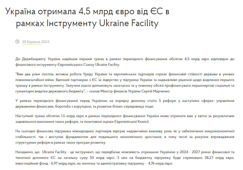 В Минфине рассказали, на что пойдут первые 4,5 млрд евро, выделенные Еврокомиссией в рамках инструмента Ukraine Facility.
