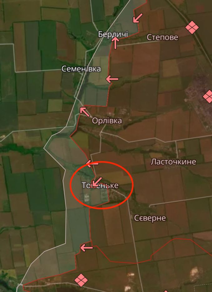 Между тем украинский Генштаб утром сообщал, что атаки противника в Тоненьком были отбиты. А на карте украинского военного ресурса Deep State показано, что Тоненькое захвачено наполовину и перерезана основная трасса снабжения ВСУ.
