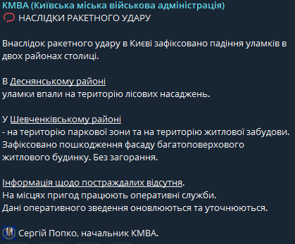Ракетный удар РФ по Киеву. Зафиксировано падение осколков в двух районах города