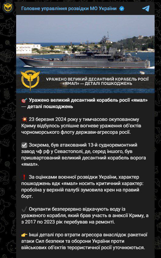 09.45 ГУР заявляет, что большой десантный корабль "Ямал" в Севастополе получил критические повреждения во время ракетного удара 23 марта.