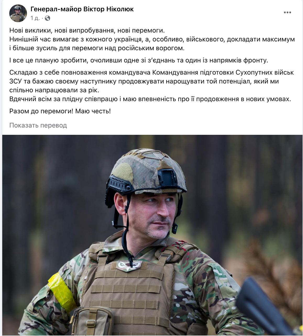 09.52 Глава Командования подготовки Сухопутных войск ВСУ Виктор Николюк сообщил о своей отставке.