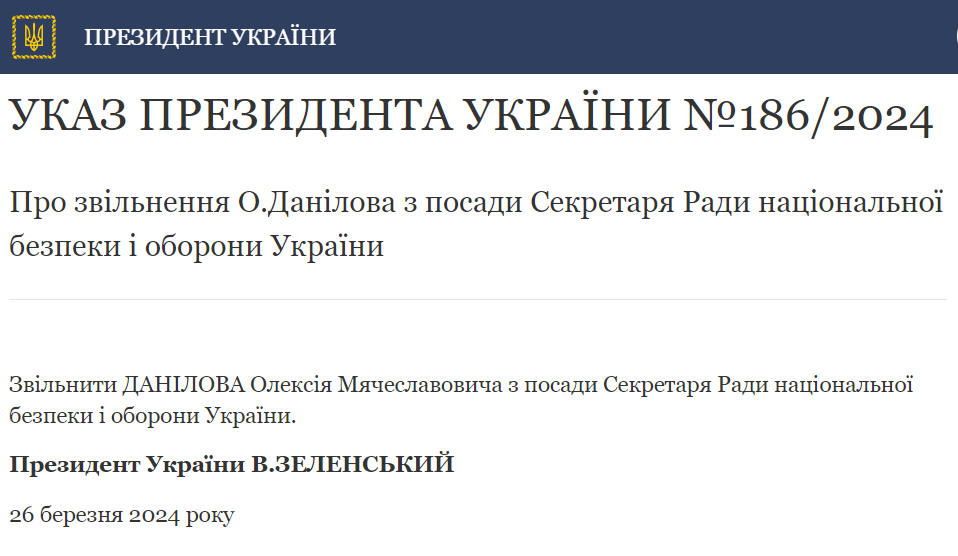 "Уволить Данилова Алексея Мячеславовича с должности секретаря Совета национальной безопасности и обороны Украины", - говорится в документе.