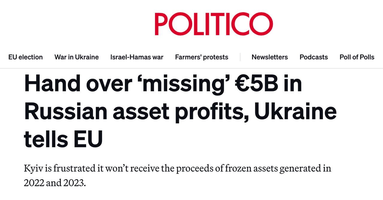 ЕС решил не передавать Украине первые 5 млрд евро прибыли от замороженных российских активов - Politico