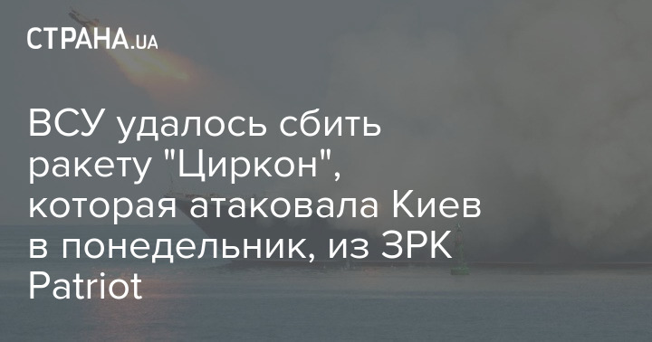 ВСУ удалось сбить ракету "Циркон", которая атаковала Киев в понедельник, из ЗРК Patriot
