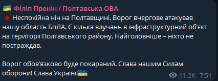 Глава Полтавской ОВА Филипп Пронин заявляет, что есть несколько попаданий в инфраструктурный объект на территории Полтавского района.