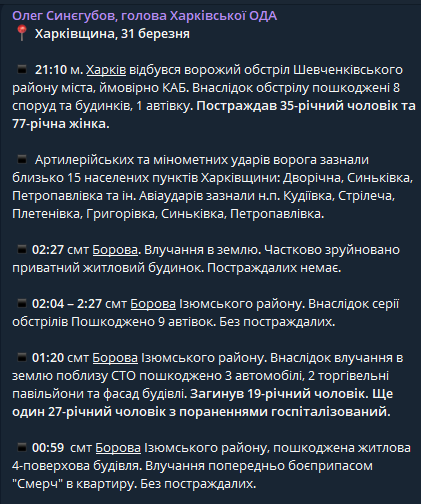 "01:20 пгт Боровая Изюмского района. В результате попадания в землю вблизи СТО повреждены 3 автомобиля, 2 торговых павильона и фасад здания. Погиб 19-летний мужчина. Еще один 27-летний мужчина с ранениями госпитализирован", - написал он.