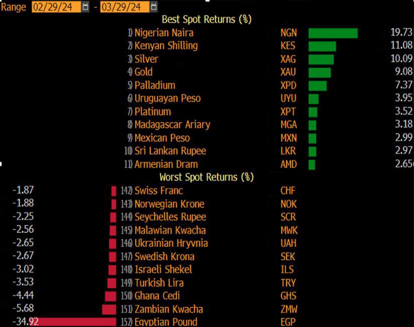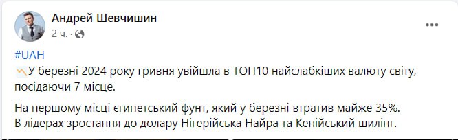 Украинская гривня в марте 2024 года вошла в топ-10 самых слабых валют мира, заняв седьмое место.