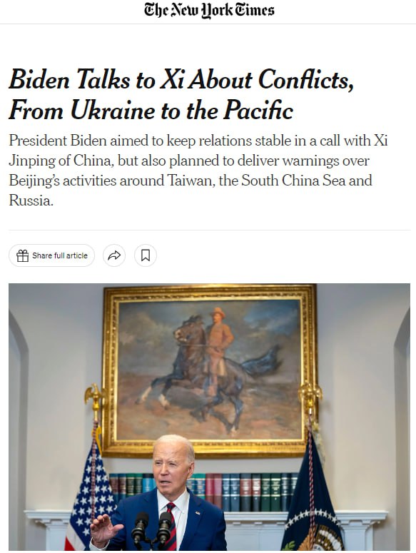 Как передает NYT, Байден "хотел подчеркнуть Си Цзиньпину, что Китай не должен продолжать помогать России восстанавливать ее военно-промышленную базу".