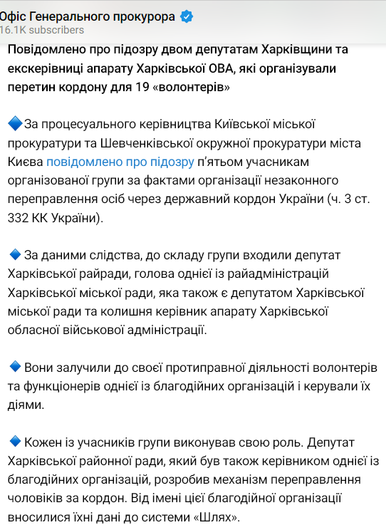 Бывшему руководителю аппарата Харьковской областной администрации Виктории Белявцевой, а также еще четырем людям, среди которых депутат райсовета и глава одной из районных администраций Харькова, объявили о подозрениях в организации незаконного вывоза мужчин за границу.