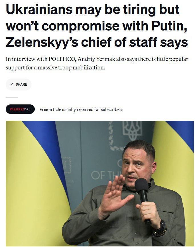 19.18 Украинцы устали от войны, однако на компромиссы с Россией Киев не пойдет, заявил глава Офиса президента Андрей Ермак изданию Politico.