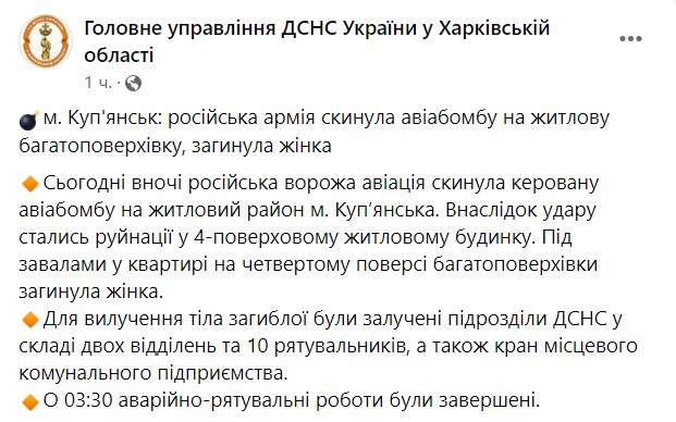 "Сегодня ночью российская вражеская авиация сбросила управляемую авиабомбу на жилой район Купянска. В результате удара произошли разрушения в 4-этажном жилом доме. Под завалами в квартире на четвертом этаже многоэтажки погибла женщина", - говорится в сообщении ГСЧС.