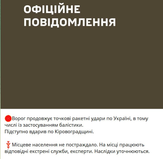 19:52 Силы обороны юга сообщают о ракетном ударе россиян по Кировоградской области.