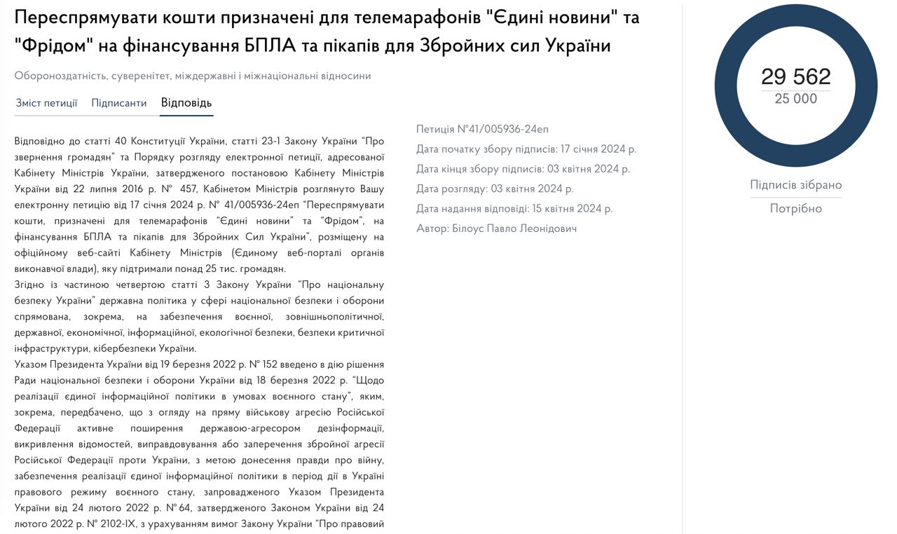 Петиция о том, что эти деньги лучше потратить на закупку дронов и пикапов для ВСУ, набрала необходимые 25 тысяч голосов. На нее ответил Шмыгаль.