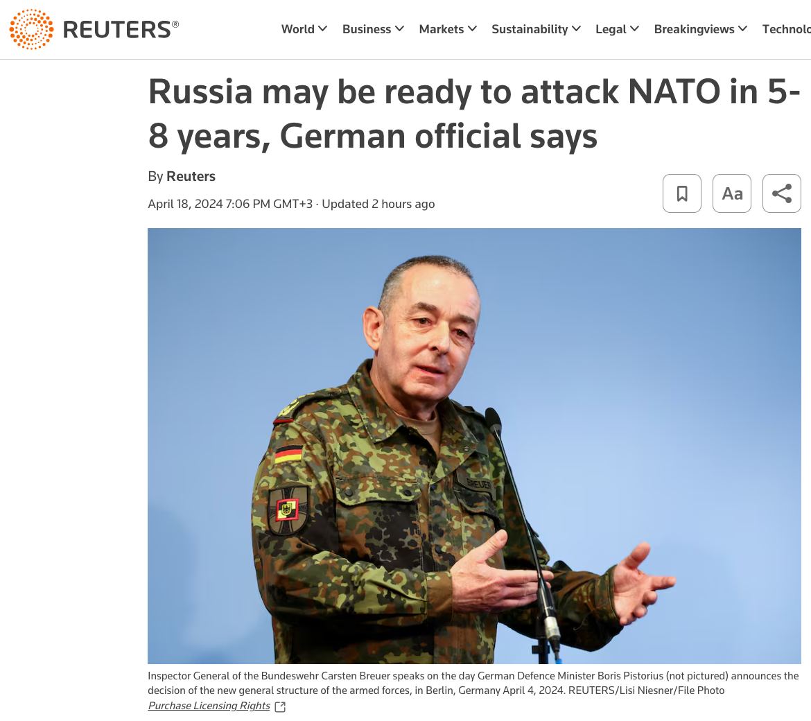 Бройер отметил, что даже с учетом продолжающейся войны в Украине Россия способна пополнять свой арсенал на случай прямого вооруженного конфликта с НАТО.