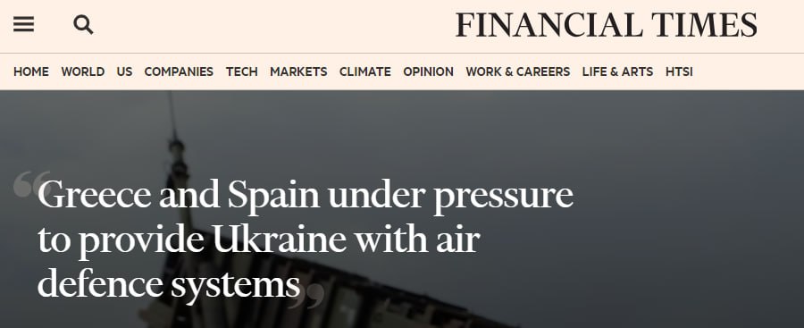 19.45 Члены ЕС и НАТО давят на Грецию и Испанию, требуя предоставить Украине системы ПВО, сообщает Financial Times со ссылкой на источники.