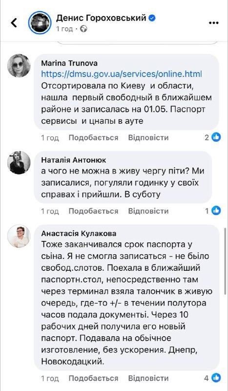 "Тоже заканчивался срок паспорта у сына. Я не смогла записаться - не было свободных слотов. Поехала в ближайший паспортный стол, непосредственно там через терминал взяла талончик в живую очередь, где-то +/- в течении полутора часов подала документы. Через 10 рабочих дней получила его новый паспорт. Подавала на обычное изготовление, без ускорения. Днепр, Новокодацкий", — отмечает пользователь.