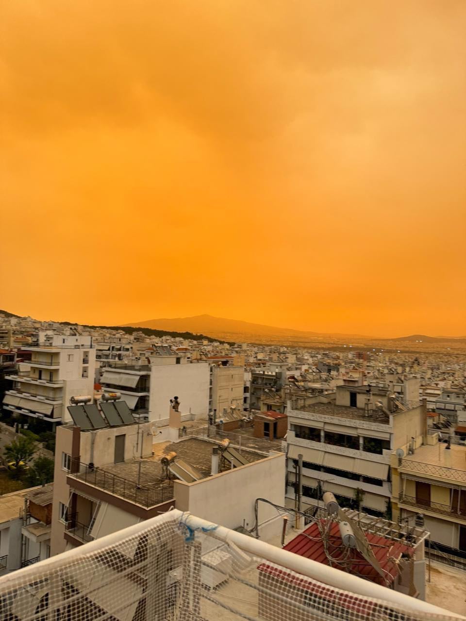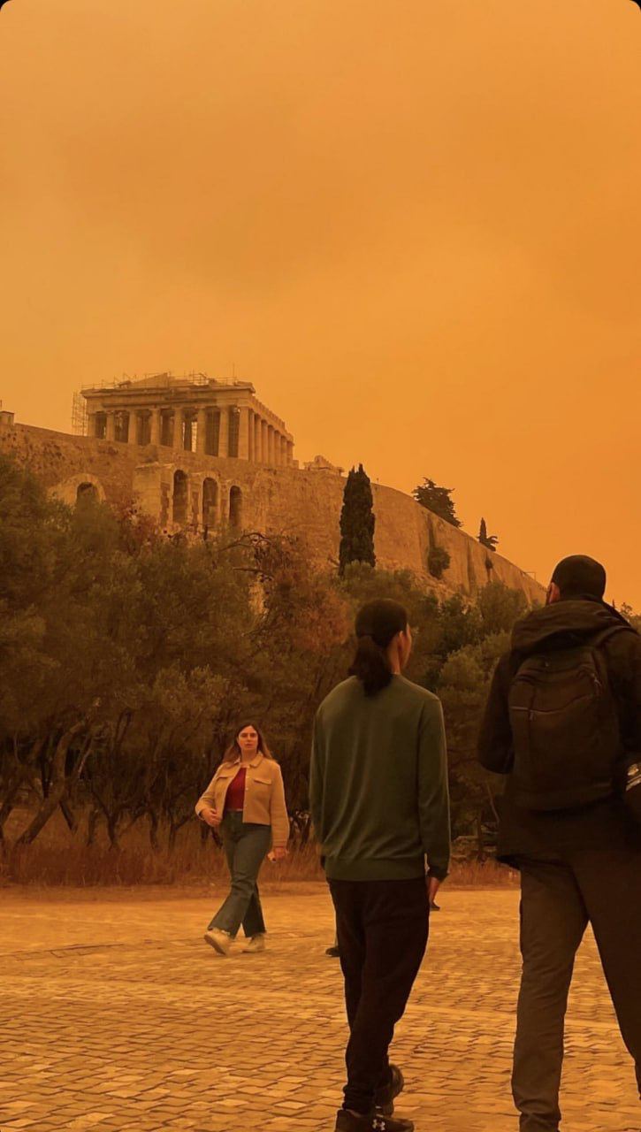 В частности, как сообщили греческие метеорологи, Афины накрыла пыльная буря из Сахары. Непогода началась 22 апреля, а сегодня, 23 апреля, достигла своего пика. Город окрасился в оранжевый цвет.