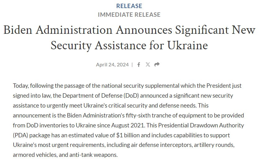 Накануне Сенат США утвердил законопроект о помощи Украине стоимостью 60,84 миллиард долларов. Решение поддержали 79 сенаторов, против были 18 законодателей. Из почти  61 миллиарда 23,2 миллиарда пойдут на восполнение передаваемых ВСУ вооружений со складов Пентагона, 13,8 миллиарда — на военные закупки для Киева на открытом рынке, а 11,3 миллиарда — на обеспечение "текущих военных операций США в регионе". На аудит выделяется 26 миллионов долларов.