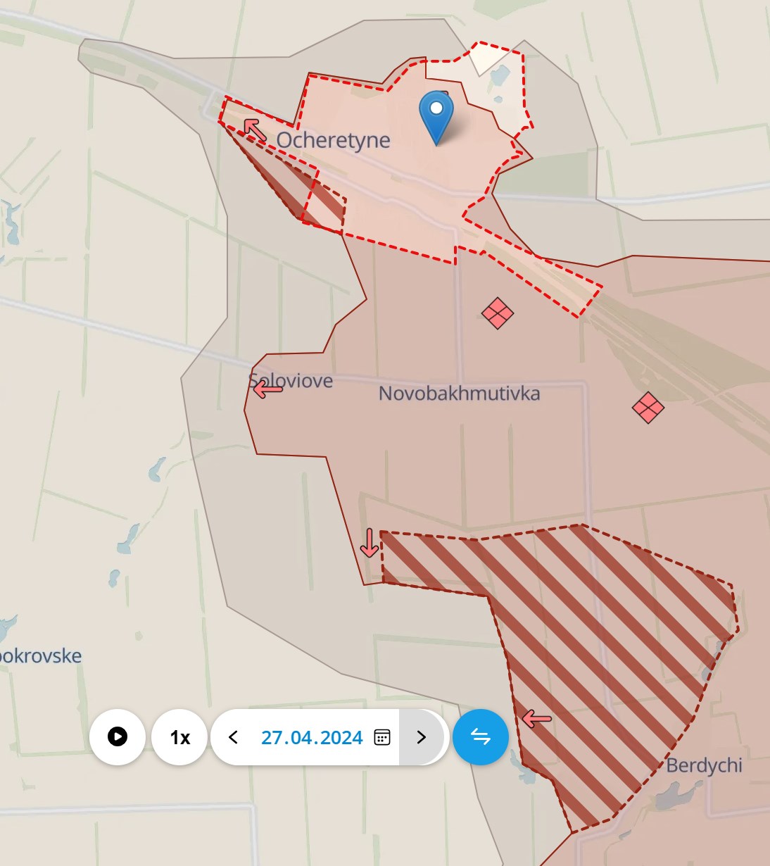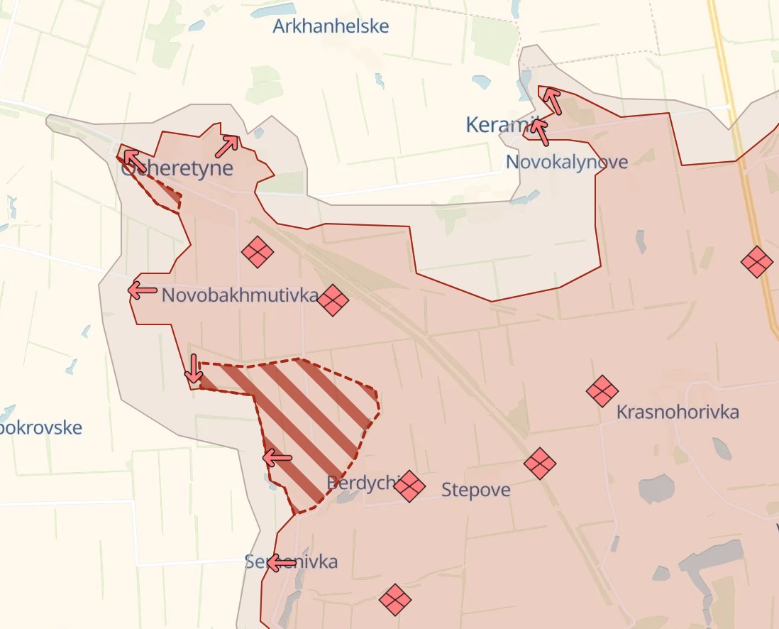 Также, по его данным, вчера были захвачены Бердычи, бои за которые длились фактически с февраля. Сегодня главком Сырский подтвердил отступление из Бердычей и Семеновки.