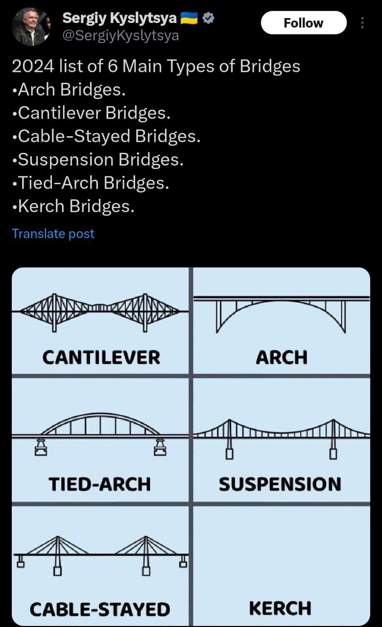 Он опубликовал картинку с разными видами мостов - арочные, вантовые, висячие и другие.