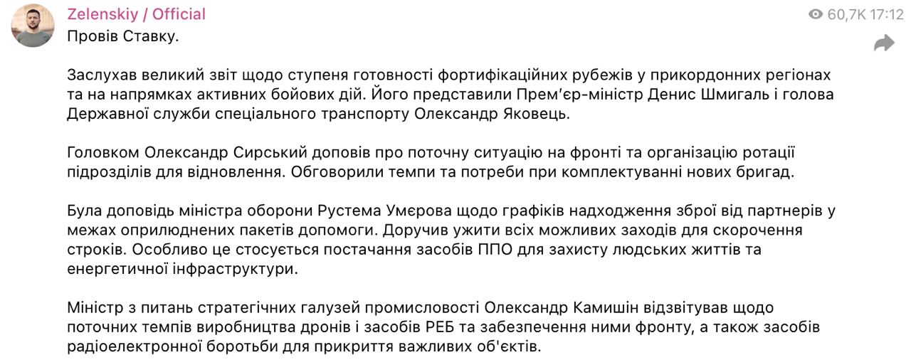 17.34 На очередной Ставке верховного главнокомандующего обсуждали строительство укреплений, ситуацию на фронте, ротацию текущих подразделений, комплектование новых бригад, поставки западного оружия и собственное производство дронов и систем РЭБ.