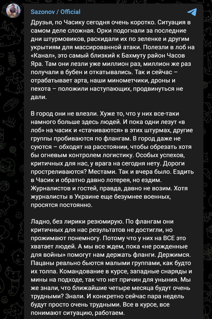 Сазонов пишет, что одни части РФ атакуют город в лоб, неся потери, но другие обходят Часов Яр по флангам, чтобы поставить под огневой контроль логистику ВСУ. Дороги, по его словам, "местами простреливаются".