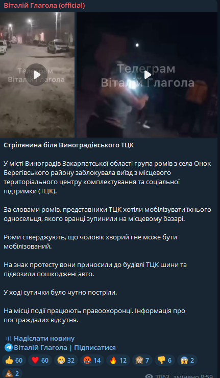 "Группа ромов заблокировала выезд из военкомата, чтобы не смогли мобилизовать их односельчанина, которого утром остановили на местном базаре. Ромы утверждают, что мужчина болен и не может быть мобилизован", - написал журналист.