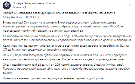 "Вчера вечером у входа на территорию Виноградовского территориального центра комплектования и социальной поддержки (ТЦК и СП) собралась группа людей, ориентировочно 10 человек, которые нарушали публичный порядок и совершали хулиганские действия", - говорится в сообщении.