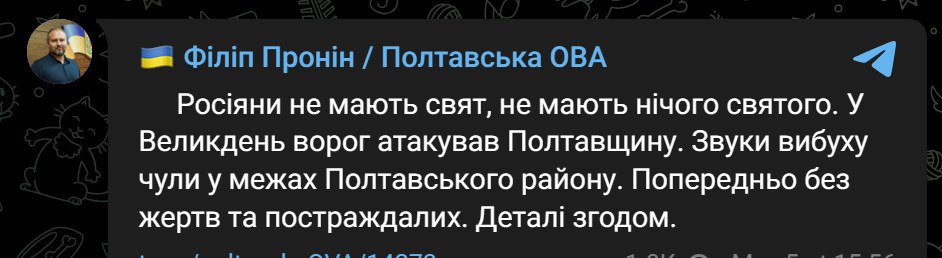 16:59 Под Полтавой прилет, подтвердил глава области Пронин. Предварительно без жертв и пострадавших.