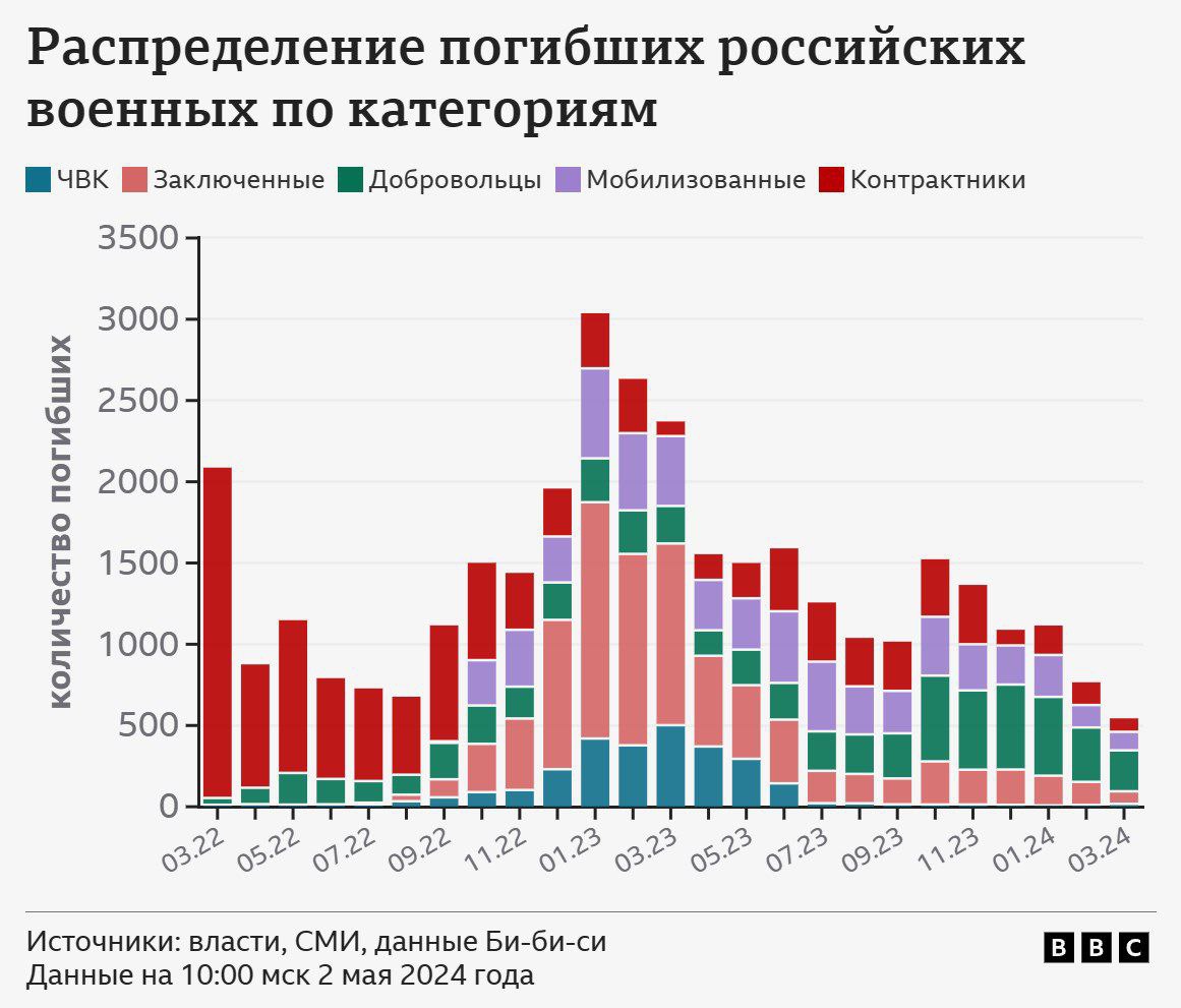 С декабря 2022 года по март 2023 года - когда бои за Бахмут резко усилились - наблюдается огромный скачок гибели заключенных, которых массово вербовал "Вагнер". За эти месяцы потери РФ достигают рекордных за всю войну, и в основном за счет бывших уголовников (на графике розовым цветом).