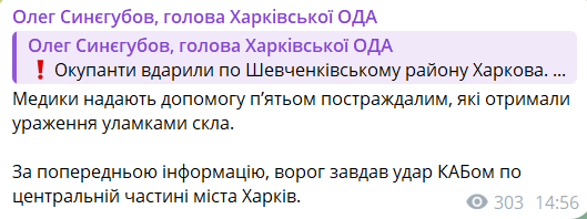 По предварительной информации, враг нанес удар КАБом по центральной части города Харькова.