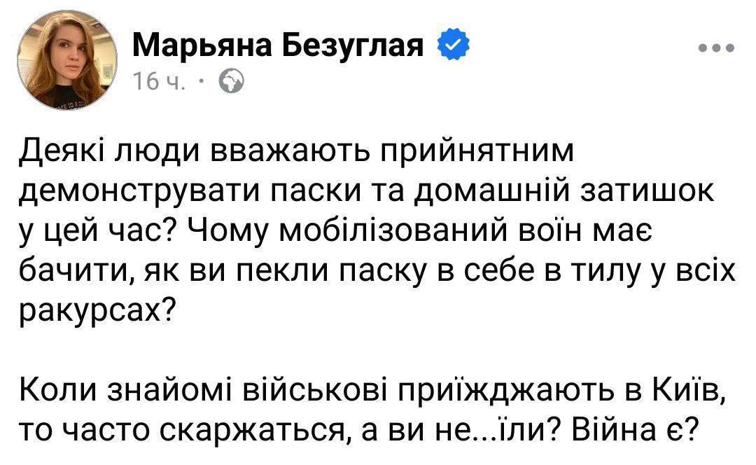 "Почему мобилизованный воин должен видеть, как вы пекли кулич у себя в тылу во всех ракурсах? Когда знакомые военные приезжают в Киев, то часто жалуются, а вы не о@уели? Война есть?" - написала Безуглая.
