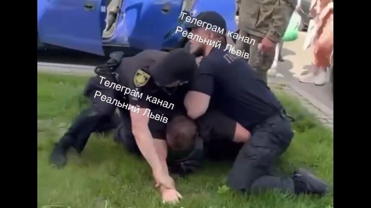 В данном случае гражданского скрутили полицейские, которые повалили его на землю и надели наручники. В это время сотрудник ТЦК отгонял женщин, которые пытались вступиться за мужчину.