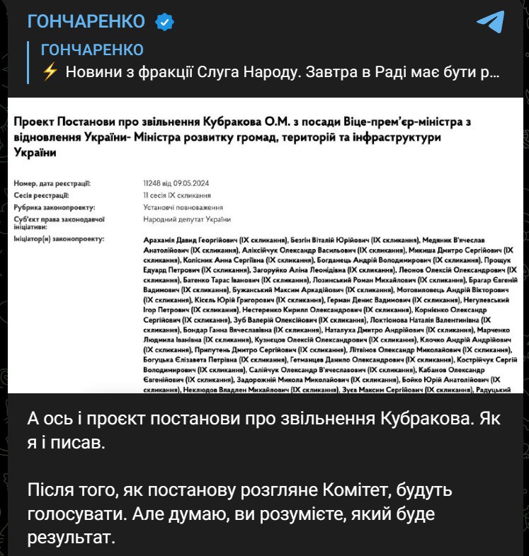 При этом следует напомнить, что Кубраков занимал два поста - вице-премьера и министра инфраструктуры. Соответствующее постановление уже внесено в Раду, сообщает народный депутат Алексей Гончаренко.